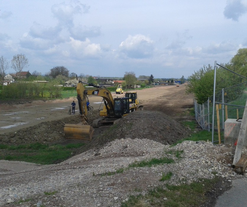 Die Bauarbeiten am Geradamm und der Straße nach Riethnordhausen gehen zügig voran. Nun lässt sich auch der zukünfige Damm erahnen und auch das neue Einlaufbauwerk des geplanten Polters östlich der Gera nimmt Gestalt an.